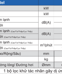 | Lưu lượng gió – Làm lạnh (Cao / TB / Thấp / Cực thấp) | 11.3 / 8.7 / 7.0 / 5.0 m³/phút |